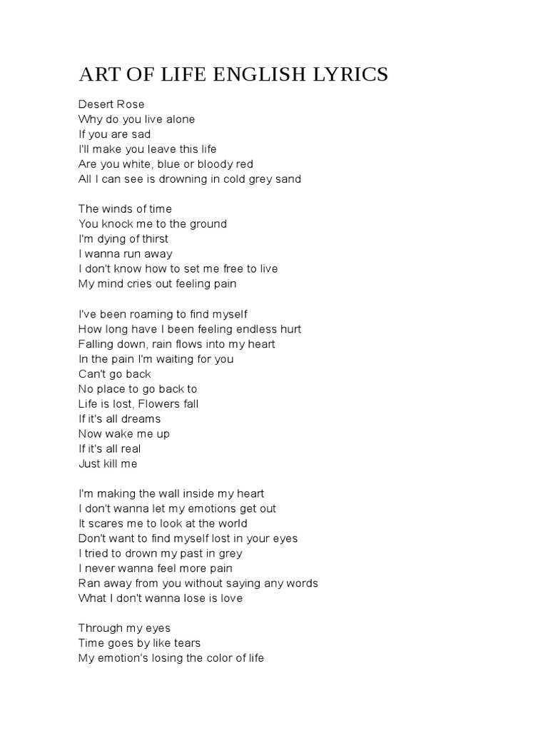 Art of life An Eternal Bleeding heart You. At each turn a hint of what one still must learn. Desert Rose Why do you live alone If you are sad Ill make you leave this life Are you white blue or bloody red All I can see is drowning in cold grey sand The winds of time You knock me to the.